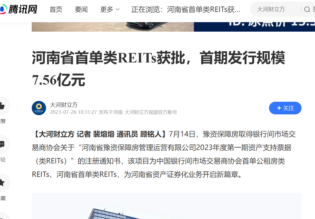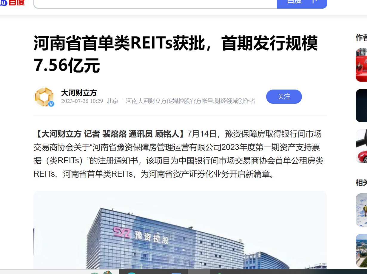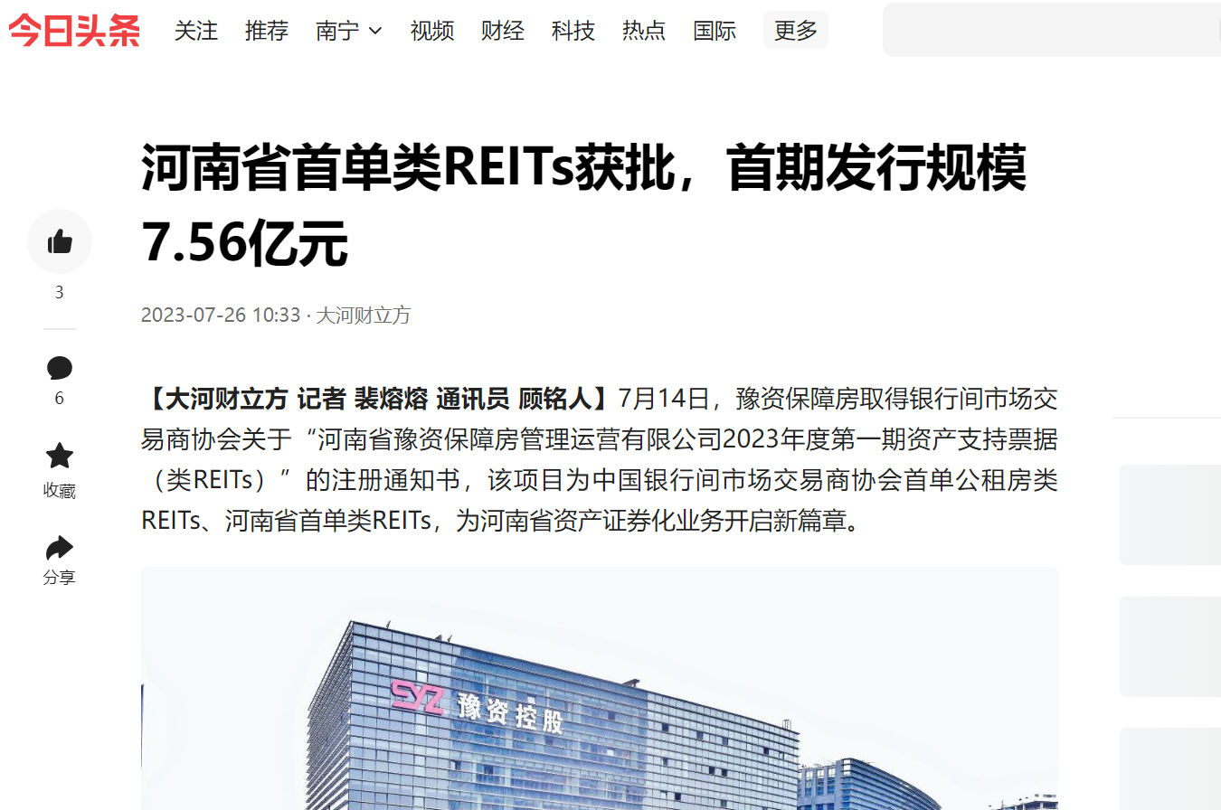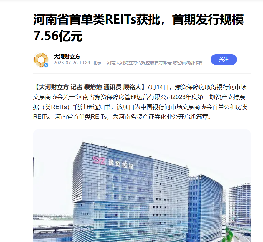 全省首單!豫資保障房類REITs項目正式獲批!引多家省級媒體轉發(fā)